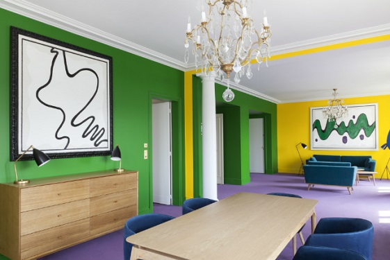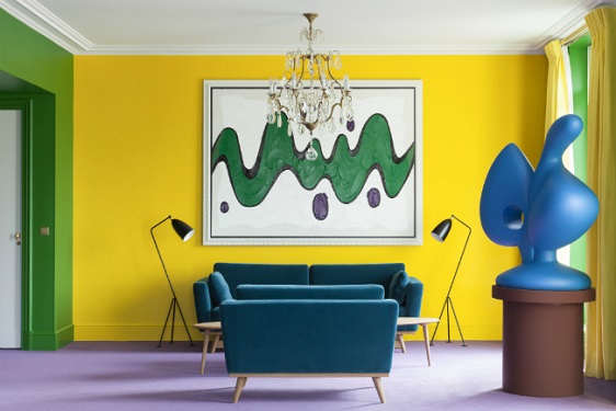 The elegant and under-played Hotel Le Bristol, Paris (Oetker Collection) has a new and surprising suite with bright green and yellow walls and Disney-esque design. Surprising? Maybe not, when you remember that le Bristol has long collaborated with artists in new and exciting ways. Now artist Bertrand Lavier has trnasfrome thej hotel’s premier suite. In 1984 Lavier began making life-size replicas for paintings or sculptures of Disney artwork inspired by a comic strip published in 1977. In the strip, Mickey and Minnie Mouse are depicted scampering through a modern art gallery. Lavier gives this fictional work an artistic reality in the magnificent Suite Paris. The elegant décor of the spacious living room of the suite (known for its Eiffel Tower views) has been transformed from ‘classic’ to ‘cartoon’. In a riot of colour and fun – with all the works for sale.