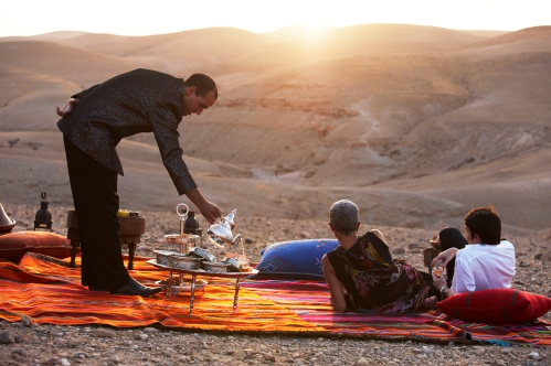 Our gentle guide Mohamed presents us with a business card which promises that 'the wonders of the desert defy your dreams and imagination'. We are enchanted. The next morning finds us up before sunrise (a rare thing) on a 4WD tour to Merzouga and the shifting sands. We stand on Lawrence of Arabia dunes at the edge of the Sahara, our scarves billowing like sails in a sea of sand. The pre-dawn desert is cold between our sandalled toes. As we watch silver sun appears and the desert begins to glow. The wind is getting stronger, whipping up the sand into our eyes and mouths. We take refuge in a low-slung Berber tent fit for a sheik and drink more mint tea.